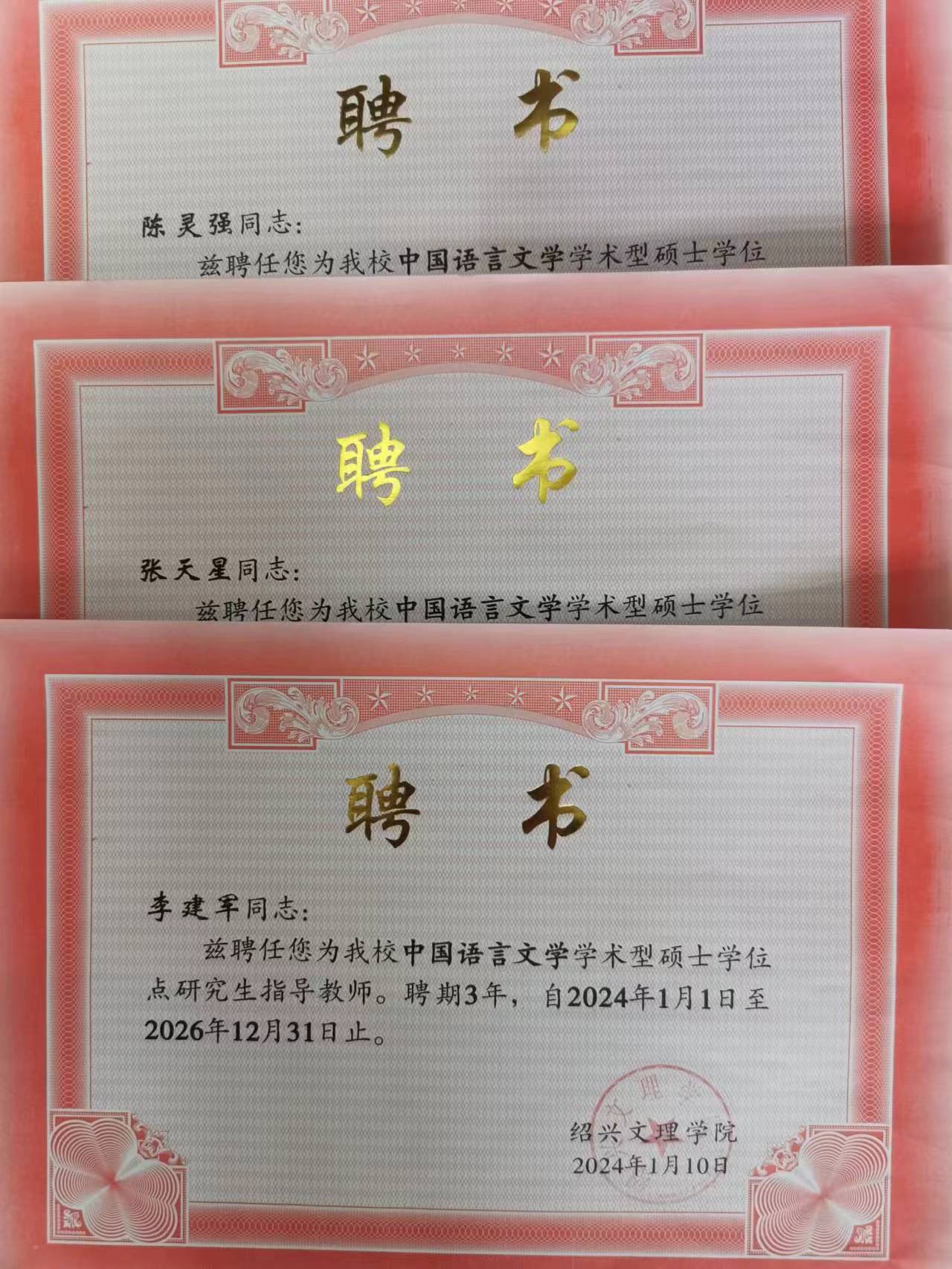 近日,我院李建军教授、陈灵强教授、张天星教授获聘绍兴文理学院中国语言文学学术型硕士学位点研究生指导教师,聘期三年。