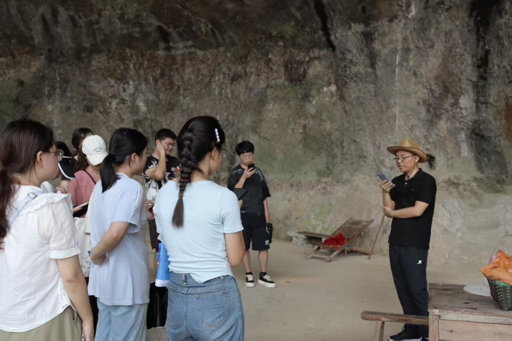 第二天,实践队来到道教南宗祖庭桐柏宫,了解了道法自然的思想,亲身感受道教倡导的万物和谐共生的思想精髓。接着,实践队来到距天台城西几十公里之外的寒岩洞,唐代诗人寒山曾在此隐居,同学们通过诵读寒山诗,感受诗人身上的“包容豁达”精神。