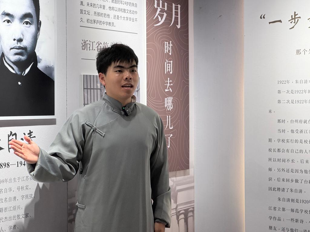 在纪念馆内,主讲同学从朱自清24岁到台州任教讲起,详述其在临海的执教岁月。“宁廉洁正直以自清乎”,此为先生改名之初心。彼时的他,带着对教育事业的热忱,走进台州的校园,以自己的学识和品德,为莘莘学子点亮理想的灯塔。