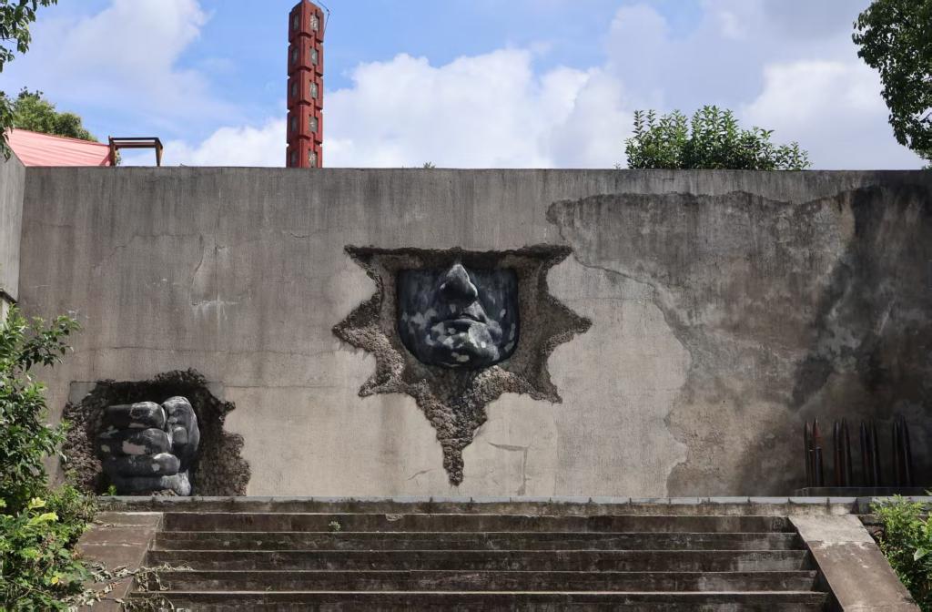 继续前行,一面独特的墙体闯入视野。墙体右边是张爱萍将军的题词碑刻“为国捐躯,名垂青史”,左边是郑洞国将军的题词碑刻“气壮华夏,国魂永存”。中间墙面上,拳头雕塑与面容雕塑从“弹孔”冲出,粗糙的质感、刚毅的形态,把人瞬间拉回烽火年月,队员们耳畔似响起枪炮声与呐喊声,眼前仿佛呈现先烈们以血肉为盾,抗击侵略者的身影。