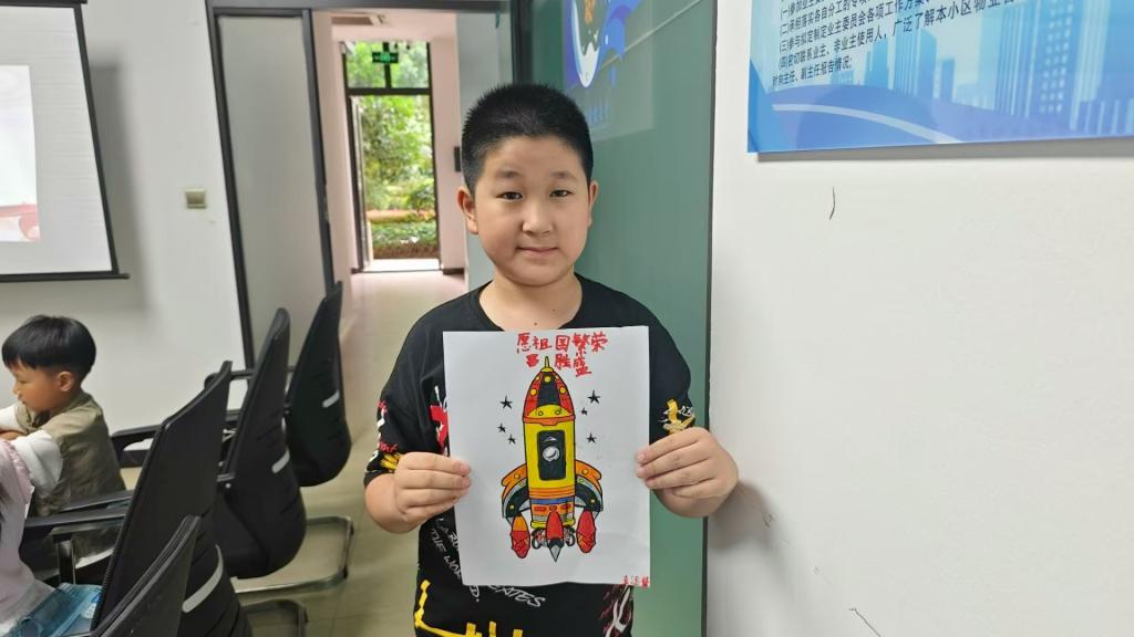 宣讲尾声,宣讲团成员组织孩子们进行了一场独属于他们的火箭绘画制作活动。小朋友们发挥想象,用彩色笔填涂着自己心中火箭的样子。活动现场,孩子们认真绘制着,并在作画结束后写上了自己对祖国的祝愿。