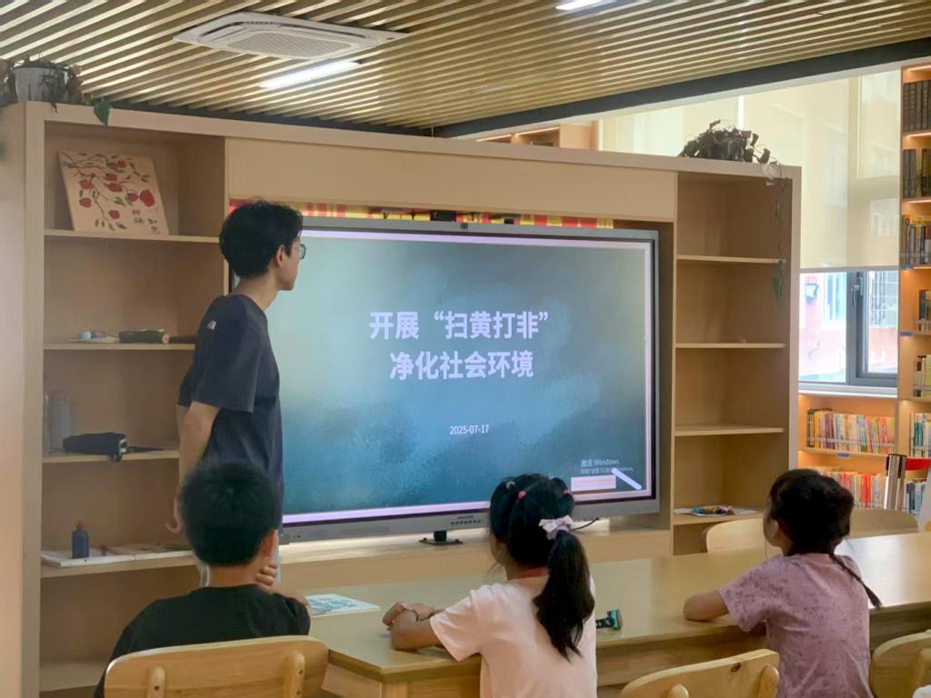 课堂讲解扫黄,知识筑牢防线。活动伊始,实践队员站在屏幕前,为孩子们带来“开展‘扫黄打非’,净化社会环境”专题课程。队员通过简洁明了的文字、生动形象的案例,向孩子们详细科普了“扫黄打非”的相关知识,剖析了不良文化对青少年成长的危害。孩子们专心致志聆听,抵制不良文化和健康阅读的种子悄然种下。