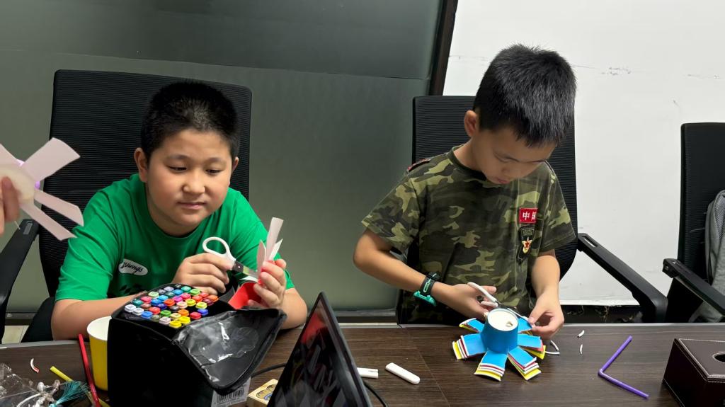 此外,实践队开设了环保课堂。成员们通过图片展示“废旧物品污染环境”与“变废为宝”的对比案例,并带领孩子们利用废弃纸杯、吸管、竹签等材料制作风车。从剪裁纸杯形成风叶,到固定吸管作为支架,再到调整角度让风车转动,每一步都充满成就感。“我以后也要收集废品做手工!”孩子们举着作品雀跃道。童声里,资源再利用的深意已化作具象可感的认知。