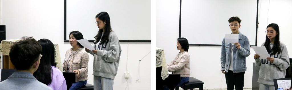 培训会在徐老师轻轻敲击的钢琴声中开始。随着老师的歌声响起,同学们也慢慢加入到《国际歌》的练习中来。徐老师告诉同学们,唱歌时一定要注意音准,要学会打开口腔,将声音“立”起来,让演唱更有层次感,更有表现力。因为对曲谱、歌词都不太熟悉,一开始同学们都不敢开口,徐老师反复示范,并用琴声带着大家慢慢掌握旋律节奏。同学们跟着老师的钢琴声进行了反复的练习,渐渐地找到了演唱的感觉。因为演出需要,还对两位主演进行了单独教学。随后培训场地也从8206转移到了tyc41183太阳成集团4楼实训室,一边进行演出排练,一边继续《国际歌》的演唱教学。在《国际歌》激昂又深情的歌声中,同学们对剧情也有了更深刻的理解。