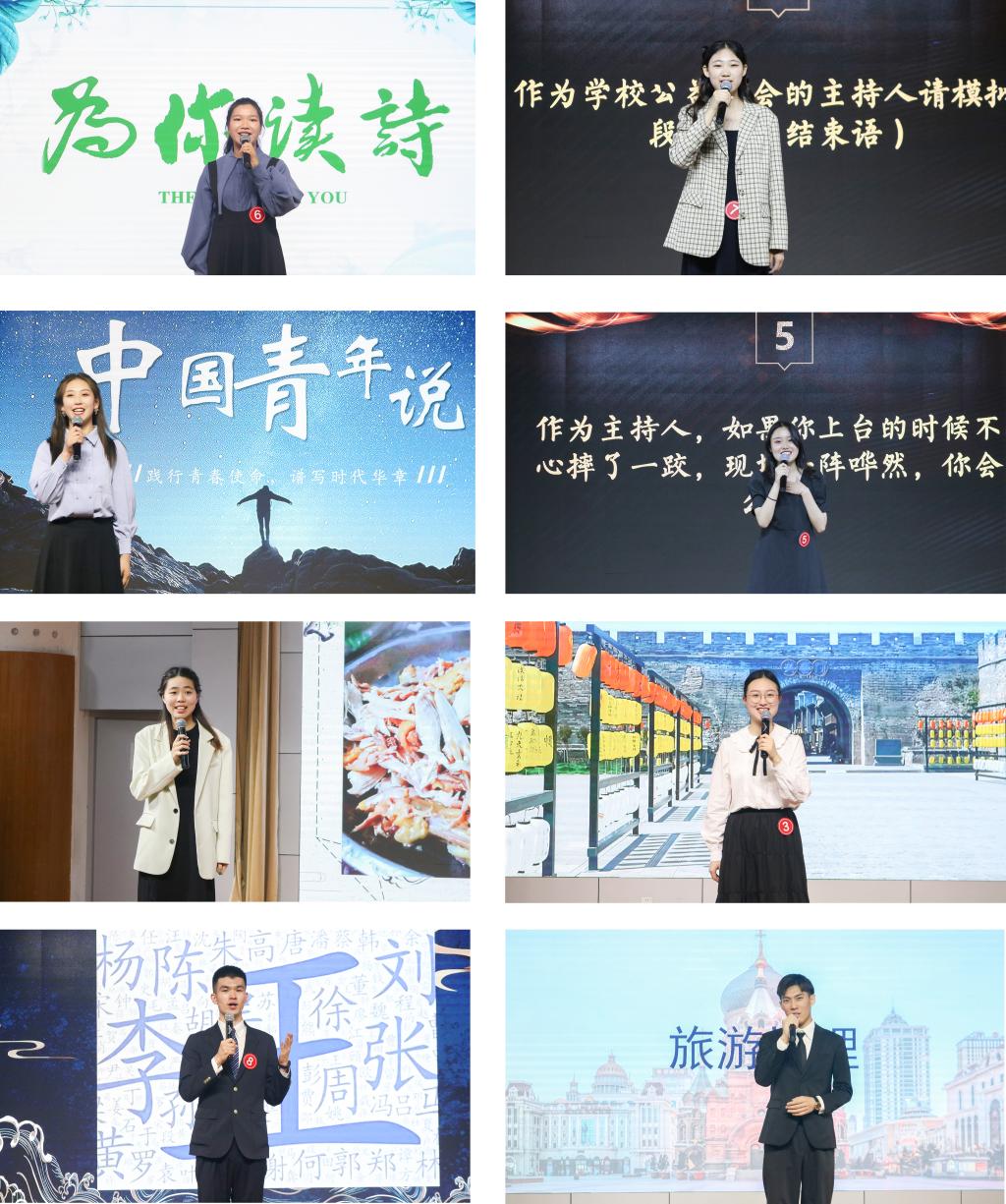 经过选拔,八名选手一路披荆斩棘,最终晋级决赛。本次决赛分搭档主持和个人主持及问答两大环节。在搭档主持环节,选手们两两组队,互相配合,评委老师进行打分并淘汰得分最低的一组选手。郁琬琳、李之韵带来现场连线报道,重走红色路,寻访红色印记,追忆“临海女杰”郭凤韶的革命事迹;马欣欣、胡怡萱为观众们带来毕业晚会主持,两位选手幽默风趣的语言搭配精心制作的视频赢得了观众的阵阵掌声;紧接着比赛进入了“个人主持”环节,选手们各显身手,向观众展示不同类型的主持:或饱含情感吟唱中国青年的感人事迹;或激情讲述新时代中国发展的宏伟脉络;或温情回忆藏在外婆家的味道……在紧张刺激的即兴问答环节,选手们运用得体的语言和巧妙的方法解决问题,展现了他们较强的临场应变能力和扎实的语言表达基础。