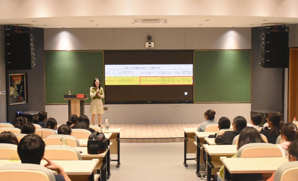 活动伊始,胡天霞学姐分享了在江苏省教育考试院任职参与成人高考录取工作的相关经历,并介绍了教育考试院的相关业务以及高考命题所采取的“入闱”方式。随后,她向同学们说明了进入事业单位的相关条件与要求,鼓励同学们树立更远大的人生目标。下面,胡天霞学姐分享了自己在巴萨罗那实习时做志愿活动的经历,此次活动于她而言意义非凡,而这一切都得益于当初考研的选择。胡学姐表示,考研可以在获得更高的学历同时获得更优质的资源。紧接着,胡天霞学姐在读研择校方面为同学们提供了宝贵意见:在择校上,要综合自己的意向和优势选择院校;择校时,需考虑城市区位因素,以获得更为广阔的视野。她结合自身的学习经历,和同学们分享了逆向思维的学习方式,即通过“目标推倒、任务分解、倒行逆施”三方面实现目标、提升自我。最后,胡天霞学姐积极鼓励同学们走出校园、开拓眼界:“如果你不走出去,你就会以为这是全世界。”
