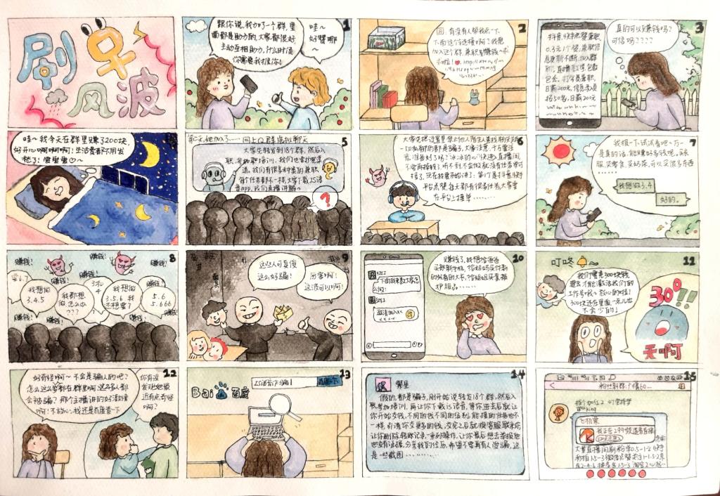 本次比赛收到包括手绘和网络作品共计28份,作品紧扣主题,题材多样,内容丰富。同学们充分发挥自己的才能,结合常见诈骗的真是案例,以情景再现的形式揭露了网络刷单兼职、投资与贷款、网上交友、中奖、退货等常见的各类诈骗手法和伎俩,同时在作品中对如何防诈骗进行提示。