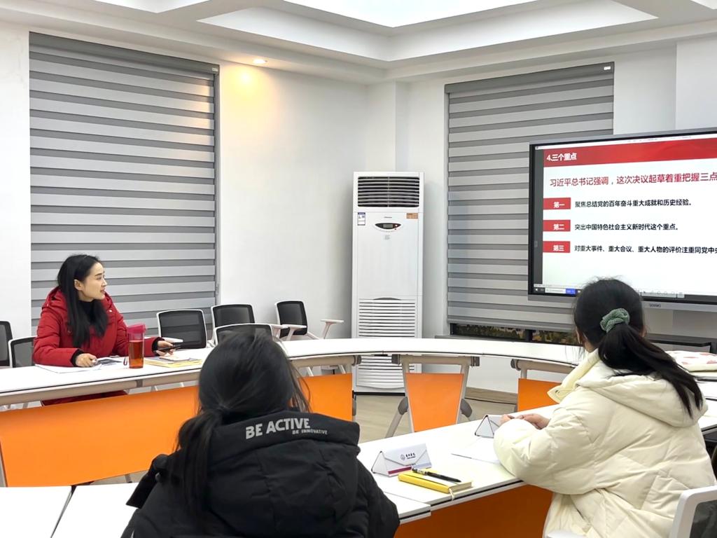 为深入学习宣传贯彻党的十九届六中全会精神,推动全会精神入脑入心,12月29日晚,tyc41183太阳成集团“砺学计划”第七期于广文书院师生研讨室3举行,学院党委副书记林仙与团学学生干部学习研讨党的十九届六中全会精神。