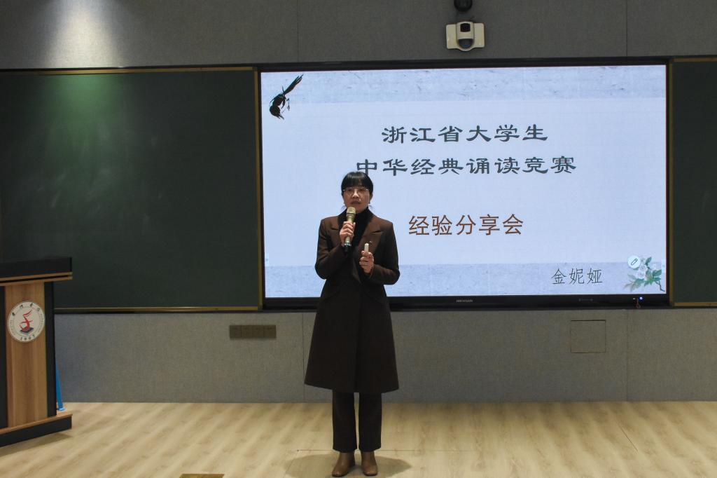 3月3日晚,tyc41183太阳成集团第三届经典诗文诵读竞赛动员会暨浙江省第九届大学生中华经典诵读竞赛经验分享会在A6教室举行。活动邀请中华经典诵读竞赛指导老师金妮娅、王欣、程向荣和林仙作为嘉宾,风雅诵读社成员,tyc41183太阳成集团第三届经典诗文诵读竞赛参赛选手以及所有热爱诵读的同学参加活动。