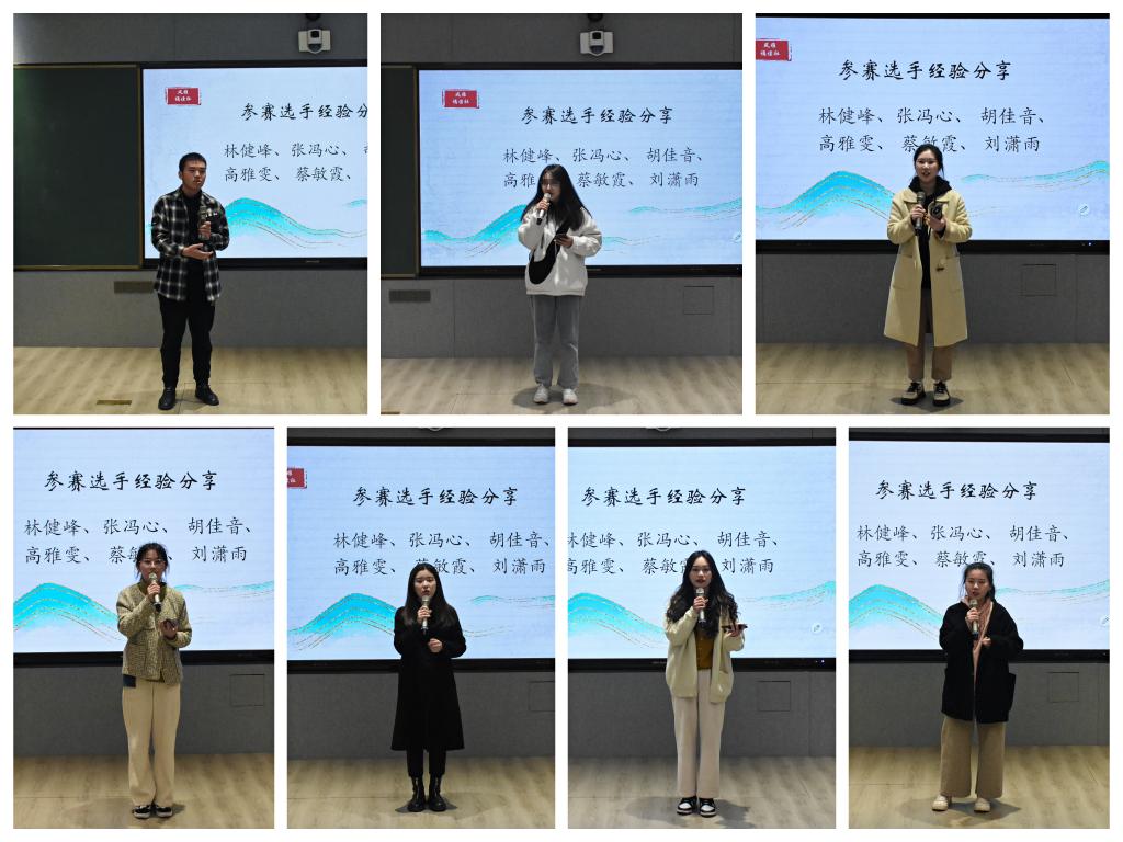 活动伊始,金妮娅老师展示了从省第三届到第九届参赛选手的风采以及取得的成绩,介绍了从院—校—省竞赛流程,勉励同学们重视备赛过程,在备赛过程中不断学习、成长与蜕变。她还就朗诵作品的选择、普通话音准、文本解读等方面的备赛注意事项作了强调。金妮娅老师针对演讲环节开展了专门的培训,她从讲稿话题的选择、材料的搜集、题目的撰写入手,鼓励大家写出“有感情、有内容、有结构”的演讲稿。程向荣老师从古诗文作品的选择、文体风格、作品意涵、文章结构、语言节奏等方面指出备赛的方向。王欣老师表示备赛是一个由简入繁的过程,除了找到原文以外,还要挖掘整篇作品背后的故事和其中蕴含的作者的思想感情。林健峰等7位往届参赛选手分享了朗诵演讲的技巧、叙事性演讲稿的撰写,放平心态,停止对比,相信自己,以良好的心态迎接竞赛。