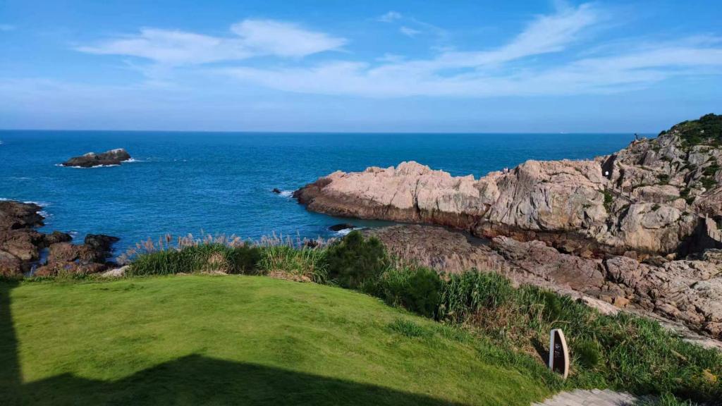 下午,实践队来到了有“东海第一大盆景”之称的甲午岩,这是大陈岛最著名的自然景观。穿过一片幽幽的黑松林,豁然见巍巍巨礁屹立于惊涛之中。壁立千仞,鬼斧神工。随之映入眼帘的便是澄澈碧蓝的大海,伴随着徐徐清凉的海风,每一个人似乎都沉浸在了大陈岛此处美好的自然风光之中。成员们踏过一阶又一阶石梯,穿过索桥,来到了灯塔处。站在灯塔边的岩石上,远眺着海平线,静静聆听着潮水抨击礁石发出的碰撞声,溅起层层白色浪花,足以使我们感受到其巍峨博大。