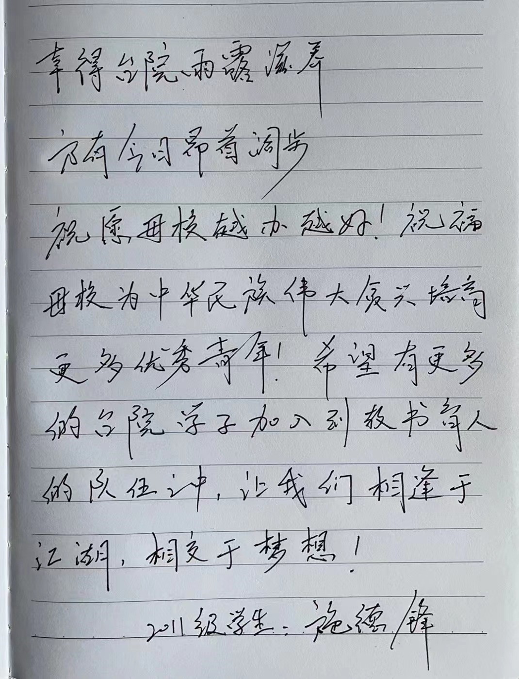 在多年从事教育行业的锻炼下,施德锋学长已经形成了一套自己的班级管理经验。学长透露道,管理好班级的第一要义就是尊重学生个性,教育的目的在于唤醒每个人的个性,在于尊重每个人的个性发展。在日常教学过程中,应该有一双善于发现的眼睛去发现每个孩子的特长;在与学生相处的时候,最好的状态就是亦师亦友的关系,既可以像老师一样教授他许多道理,也可以像朋友一样和他沟通。