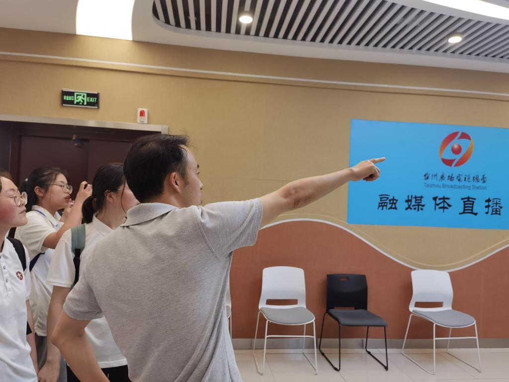 采访过后,夏亦冰带领队员们参观了台州广电。队员们来到融媒体云平台,了解了“中央信息厨房”系统的功能,深切见识到幕后媒体人的辛劳工作。夏亦冰简要介绍了台州广电的发展历程和融媒改革的进程,随后带领队员们参观了演播厅、直播室、广播室等主要岗位的工作场景,对媒体人的工作有了更加深入的了解,开阔了队员们的眼界。