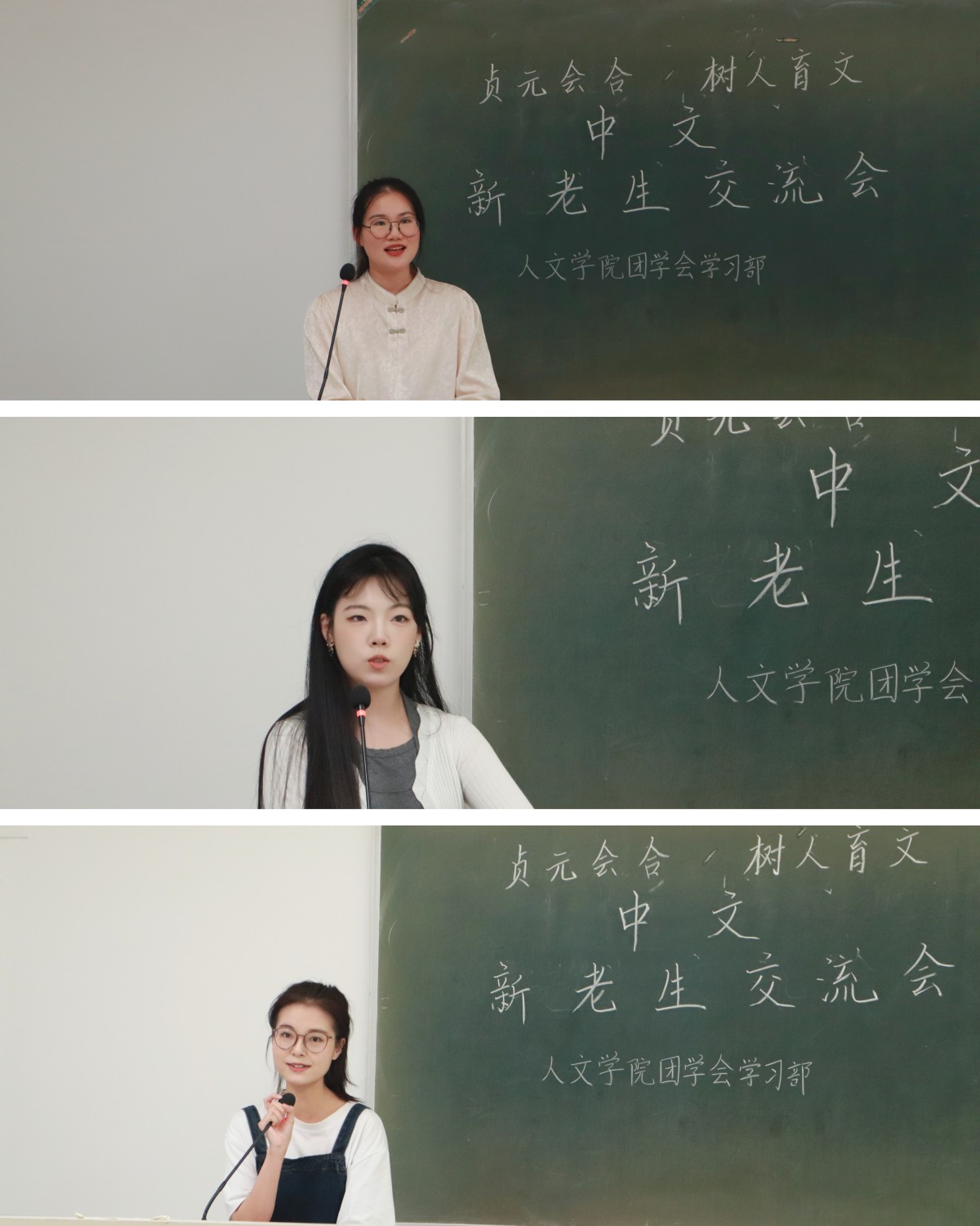 在中文专业会场上,周紫亿建议新生们对自己要有清楚的认知,要努力抓住生活中的机遇,不断提高听说读写的能力以此获得成长。程嘉琳分享了自己的实习经验,她建议同学们合理规划大学生活,积极参与各种活动,并鼓励大家勇于尝试、挑战自我,为将来就业做好铺垫。王俊霞建议新生们在大学期间树立正确的人生目标,并为大家分享了有关学习的妙招。“行动力永远是解决问题的最优方法。”最后,她鼓励大家奋发上进,努力实现自己的人生理想。