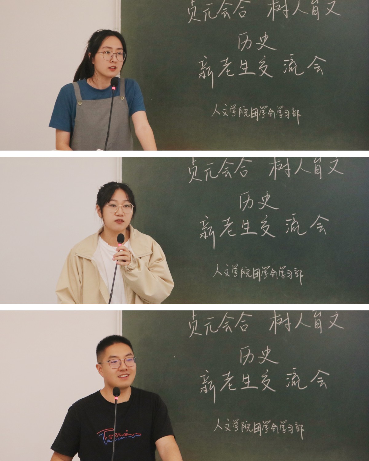 在历史专业会场上,陈飞雪以“在人文,在历史,遇见更好的自己”为题,分别从学习、课题、工作、比赛这四个方面向大家分享了相关经验。她表示在加强体育锻炼的同时,要学会借助辅助工具提高个人学习能力,同时也要学会合理规划自己的学习生涯。她还鼓励大家积极参与各大比赛,积累制作课题的经验,明确自己的定位。柴于晨以“有目标,有方向”为题,向大家分享了关于考研考编的经验,鼓励新生们树立正确的目标和方向。她向大家讲述了完成目标的“三步法”,并建议大家合理利用时间、确保有事可做、拒绝无效忙碌。杨世江以“在平凡中成长”为题,他就四个“平凡”总结了他的大学生活。杨世江建议大家要认识自己的平凡但决不能平庸,积极尝试、敢于突破才能打破平凡。