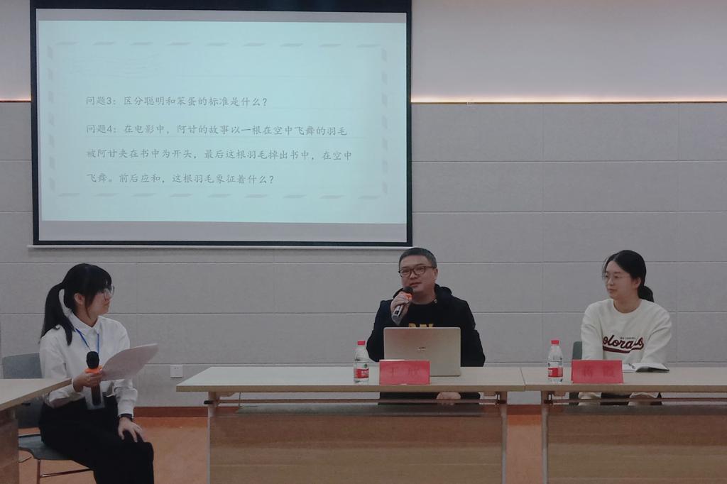 在随后的老师主评环节中,王欣老师先谈了《阿甘正传》在电影史上的崇高地位,并解读了电影的历史背景与美国的价值观,指出阿甘就是美国的缩影,这一见解极大地开拓了同学们的视野。王老师也谈及“经典伴人成长”,指出在不同年龄阶段欣赏经典,总有不同的感受,并给予《阿甘正传》很高的评价。