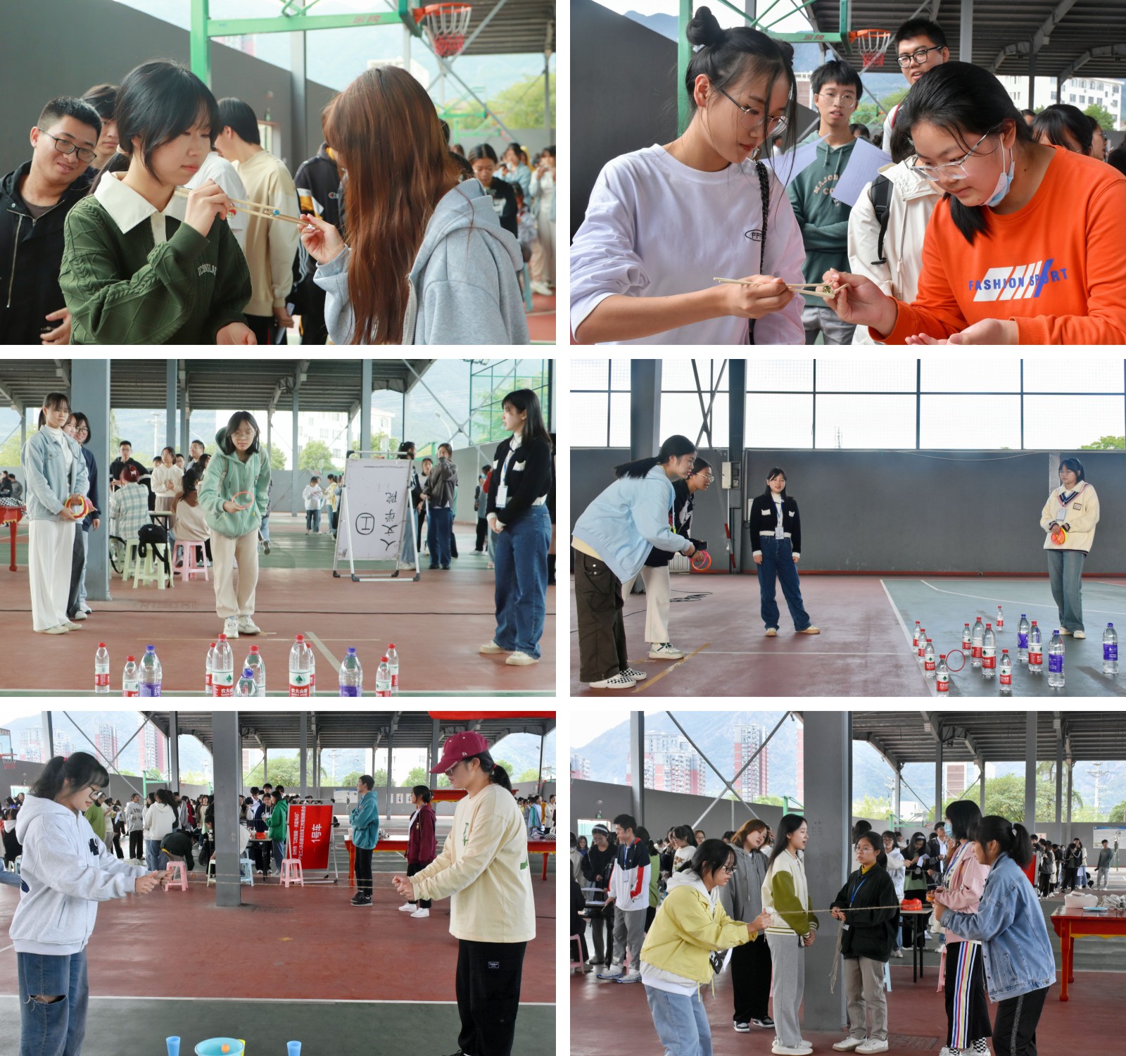 开幕式后,同学们以寝室为单位在风雨篮球场参加“小王子的宇宙之旅”趣味游园活动。活动由“国王的命令——夹弹珠”“对知识的崇拜——九宫格记忆挑战”“实业家的困扰——线上乒乓球”“商人的新业务——矿泉水瓶套圈”“告诉点灯人号码——嘴巴手指不一样”五个项目组成。寝室成员们在每个项目中相互配合,努力合作,鼓劲加油。现场环绕着同学们的欢声笑语,无论输赢,大家的脸上都洋溢着快乐的笑容,在有趣的游戏中团结协作,收获满满默契。