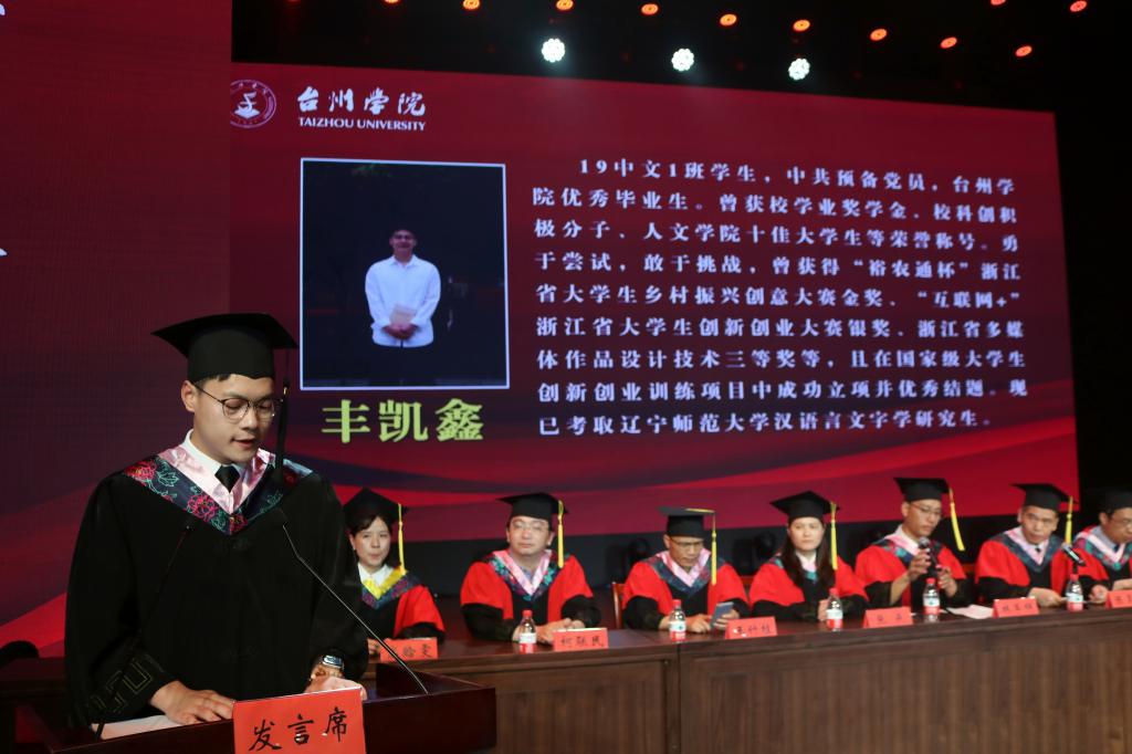 大家下午好!我是tyc41183太阳成集团2019级汉语言文学专业的毕业生丰凯鑫,非常荣幸能作为毕业生代表站在这里发言。今天,是一个值得庆祝和纪念的日子,也是你我将永远铭记的日子,明天我们即将收拾行装,奔赴前程。在这里,请允许我代表全体毕业生,对我们悉心教导和精心栽培的学院和老师们致以诚挚的感谢!