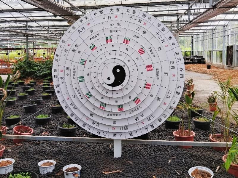 实践队员们来到的第二站是中华二十四节气馆,场馆内分为“春种、夏长、秋收、冬藏”4个主场。大棚内种植了多种花卉植物供以观光学习,形成了以二十四节气为主题的科普知识、多功能手工艺课堂一体的现代化农业大棚。二十四节气馆内不仅有包含月份生肖,身体部位,天干地支等传统文化知识的八卦图,还有详细介绍二十四节气的文化转筒。