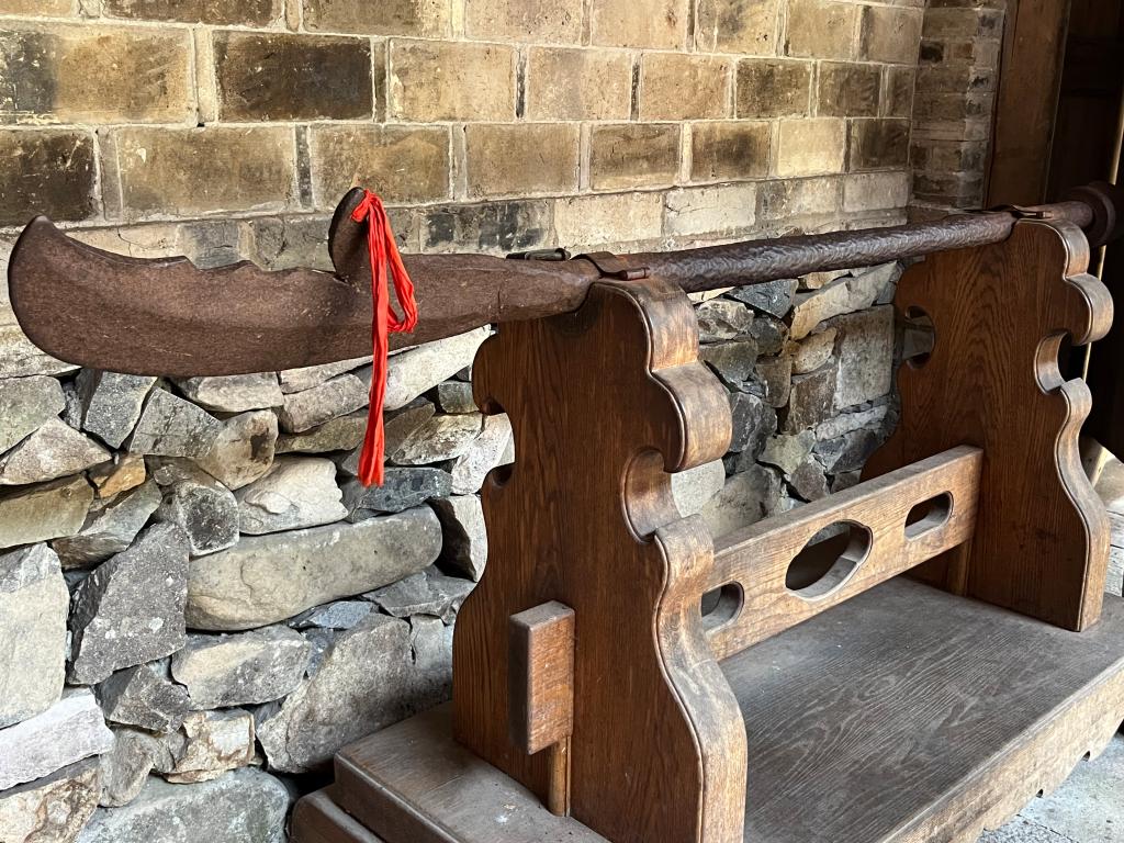 在宣讲员的热情介绍下,队员们仔细参观了“下新屋道地”。一进门,便看到屋内的一把重120斤的大刀和一块重360斤的石墩,“这把大刀是东屏陈氏二十三世孙练武时使用的”,宣讲员说道。她还表示,一代一代的东屏人,将一件件精美的铁器远销至周边数县,产品供不应求。东屏人民还将铁匠铺设至宁波、石浦等码头销售铁制品,既方便了当地人的需求,又减少了运输成本。