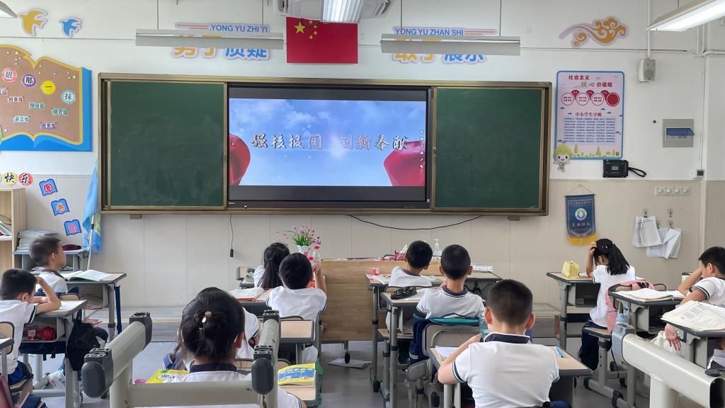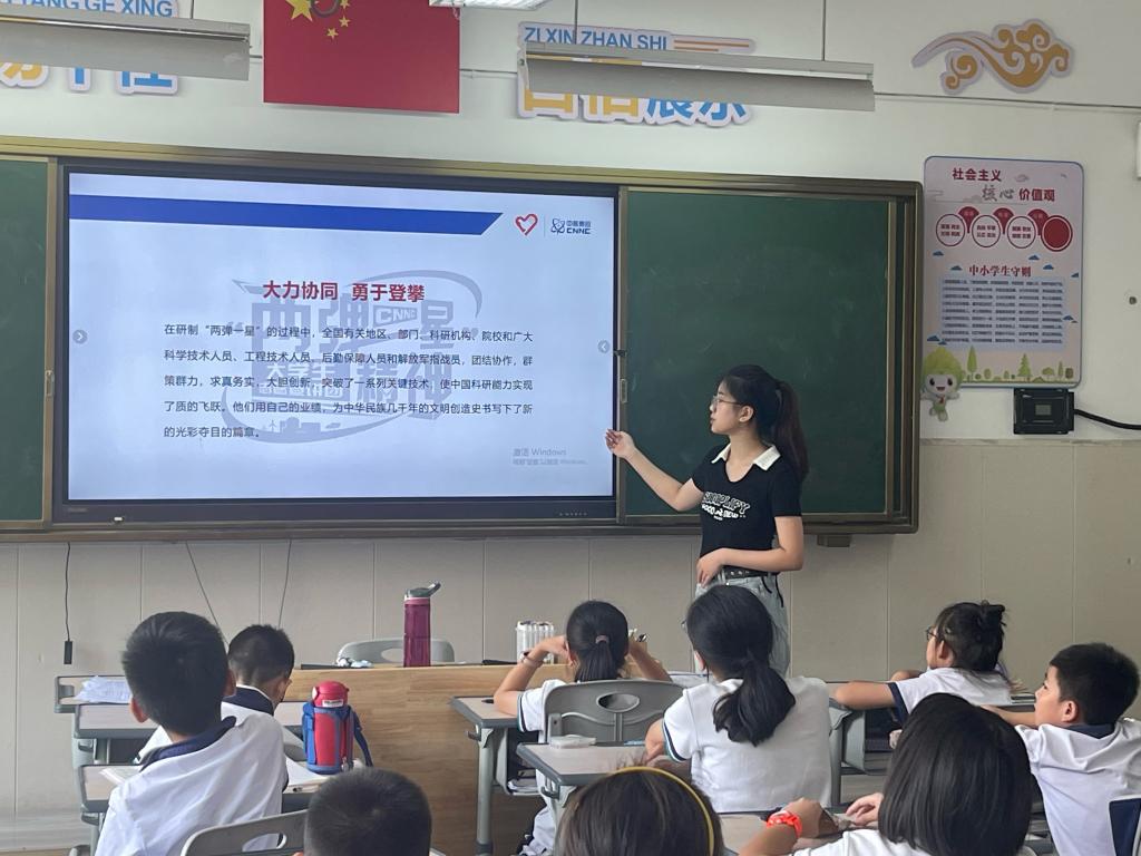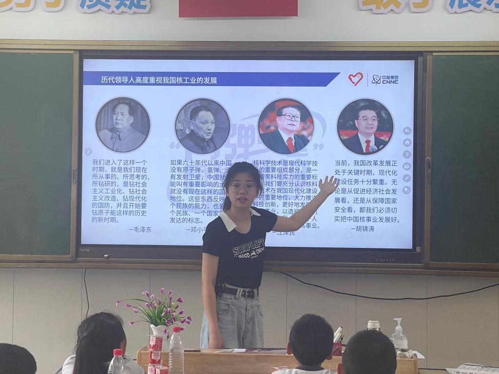 孩子们在学习了解“两弹一星”精神的过程中,对核工业发展历程也有了充分了解。宣讲员以党领导下的中国核工业为主题,从历代国家领导人对核工业发展的态度出发,和孩子们共同探讨了党领导下的我国核工业从一无所有到核铸强国的发展历程。