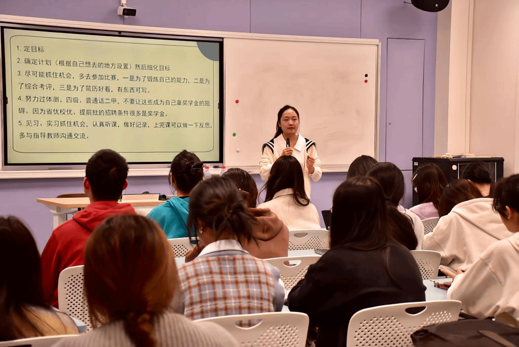 活动伊始,陈心涵以温州与台州地区的教师招聘考试考情为例,介绍了教师招聘考试中需要注意的事项,并且尤其建议大家参加提前批的考试,提高录取概率。同时,对于考前预备时期,她给了大家三条宝贵建议:一是要提高自己的表达能力和形象气质,二是尽量提前四个月做好准备,三是大学期间定位好自己的人生方向。随后,她给大家分享了自己的应试经验。她强调,一定要努力过四级、体测、普通话二甲等,这些条件是拿奖学金与提升综测成绩的基础。此外,她建议,大家上课认真听讲,不要把时间浪费在电子产品上,只有在大学期间不断提升自己,才能让自己未来的生活有保障。最后,陈心涵希望在座的每位同学都能做到心与行动一致——心里想着努力,行动也做到努力,尽情感受大学生活的美好,成就快乐人生。
