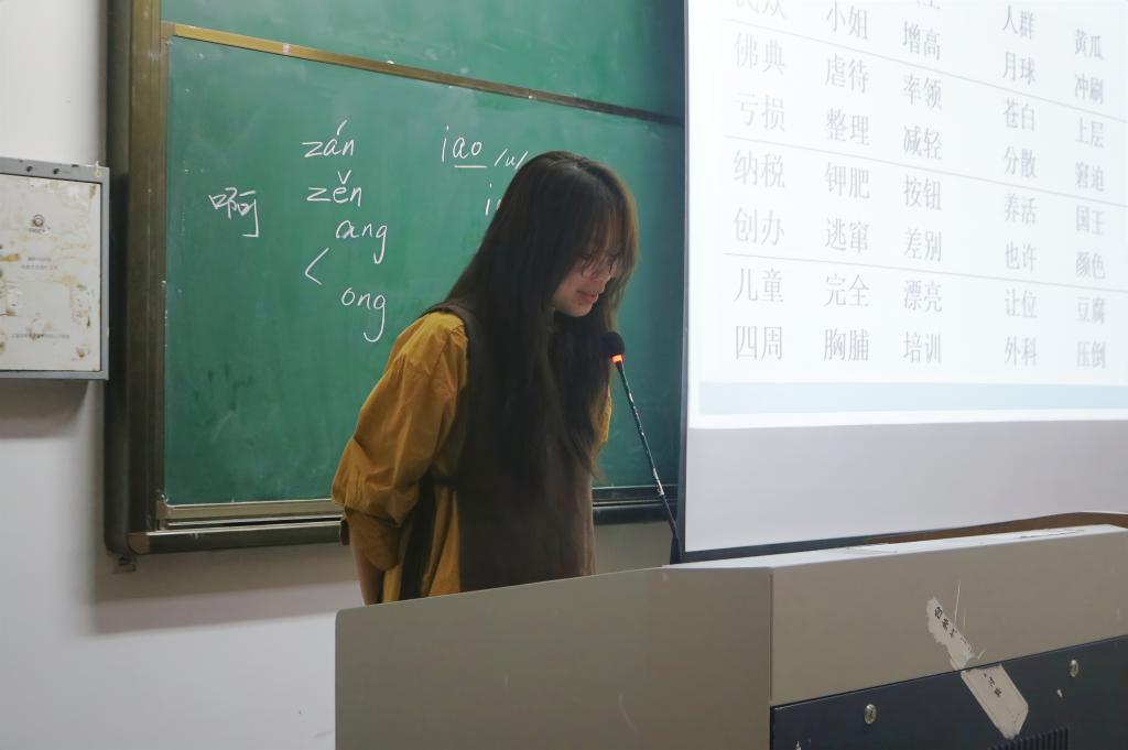 金妮娅强调,对于普通话水平测试,同学们要有所准备,建议大家要多听多读多练,并详细讲解了普通话水平测试的等级评定标准和内容要求。在字词发音、朗读短文、命题说话等方面,她通过示范读、带读、个别读、集中练读等多种方式,与现场同学开展互动,对同学们常见的错误语音和发音缺陷予以纠正。她指出,学好普通话的前提是要找到正确的发音位置,掌握好发音要领,在日常学习中,还要反复记忆和不断训练。参加培训的同学们跟着金老师的示范,认真地摸索着、练习着,现场学习气氛热烈。