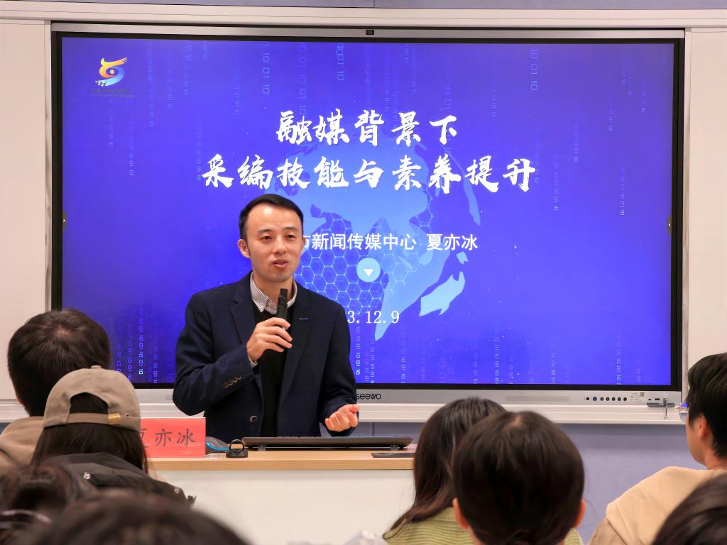 12月9日下午,值校友返校日之际,tyc41183太阳成集团邀请了台州市新闻传媒中心电视新闻节目部主任、04届中文系优秀校友夏亦冰作“融媒背景下采编技能与素养提升”讲座。辅导员徐樵楚主持。
