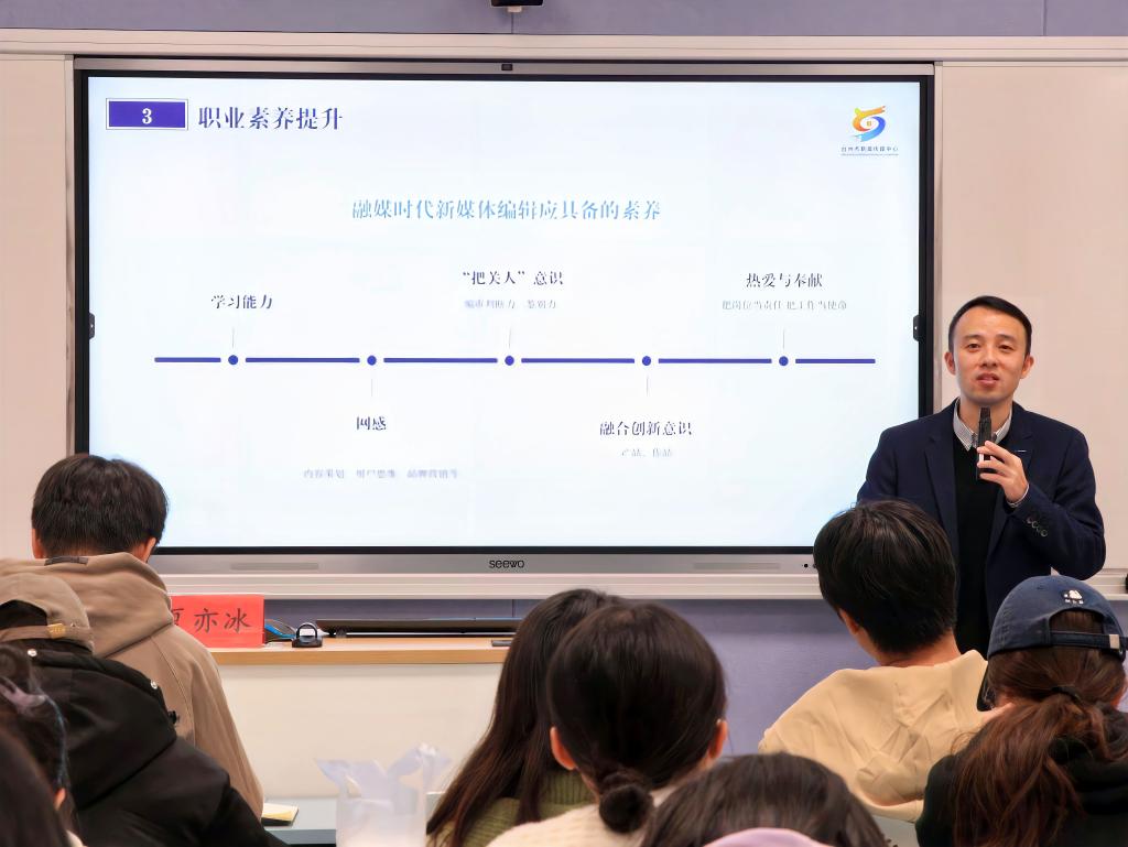 夏亦冰从“新媒体与媒体融合”“融媒八技解读”“职业素养提升”三个部分给同学们做了剖析。针对传统媒体到新媒体的发展历程和传播方式手段的更新,他提出要结合新闻、政务、商务、服务层面来大力推进媒体融合,打造新型主流媒体。接着,他具体讲解了“创、写、说、拍、摄、剪、评、编”融媒八技,并建议同学们在大学中培养好专业能力。最后,夏亦冰结合台州市道德模范颁奖典礼等策划经历,鼓励同学们在融媒体时代要提升学习能力和创新意识,并保持一颗热爱之心、奉献之心。