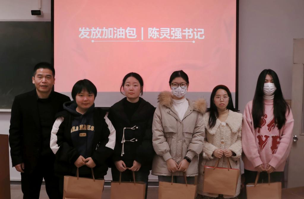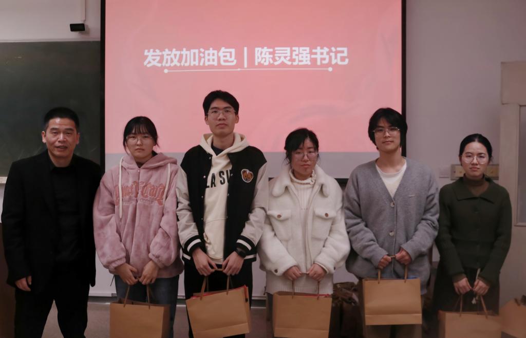 陈灵强在讲话中希望同学们要有必胜的决心,他以往年上岸的学长学姐为例,鼓励同学们要自信;二是要有坚定的信心,不要退缩;三是要有健康的身心,他提醒同学们注意身体,放松心情,轻装上阵。会上他代表学院为考研学子送上了精心准备的考研加油包,并祝愿同学们得偿所愿,金榜题名!