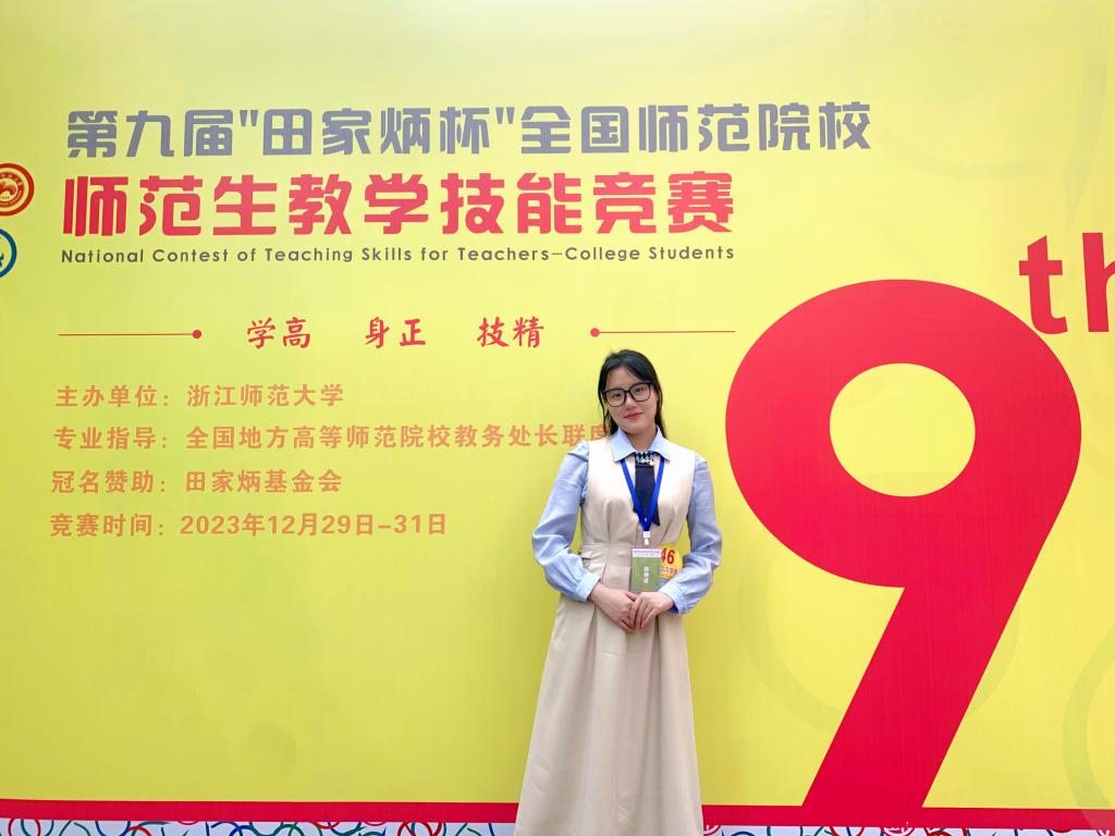 2023年12月29日至31日,第九届“田家炳杯”全国师范院校师范生教学技能竞赛决赛在浙江师范大学落下帷幕。tyc41183太阳成集团2020级汉语言文学(师范)专业学生胡怡萱荣获“高中学段汉语言文学专业组别”一等奖,这是学校唯一一名师范专业参赛选手。