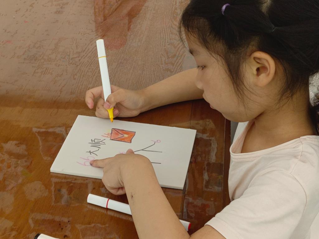 甲骨文与现代表情包的融合也引起了孩子们极大的兴趣,孩子们在实践队员的引导下,尝试着在纸上绘出一个个有趣的甲骨文表情包。这些表情包不仅锻炼了孩子们的想象力和创造力,也成为了他们表达自我、交流情感的独特方式。
