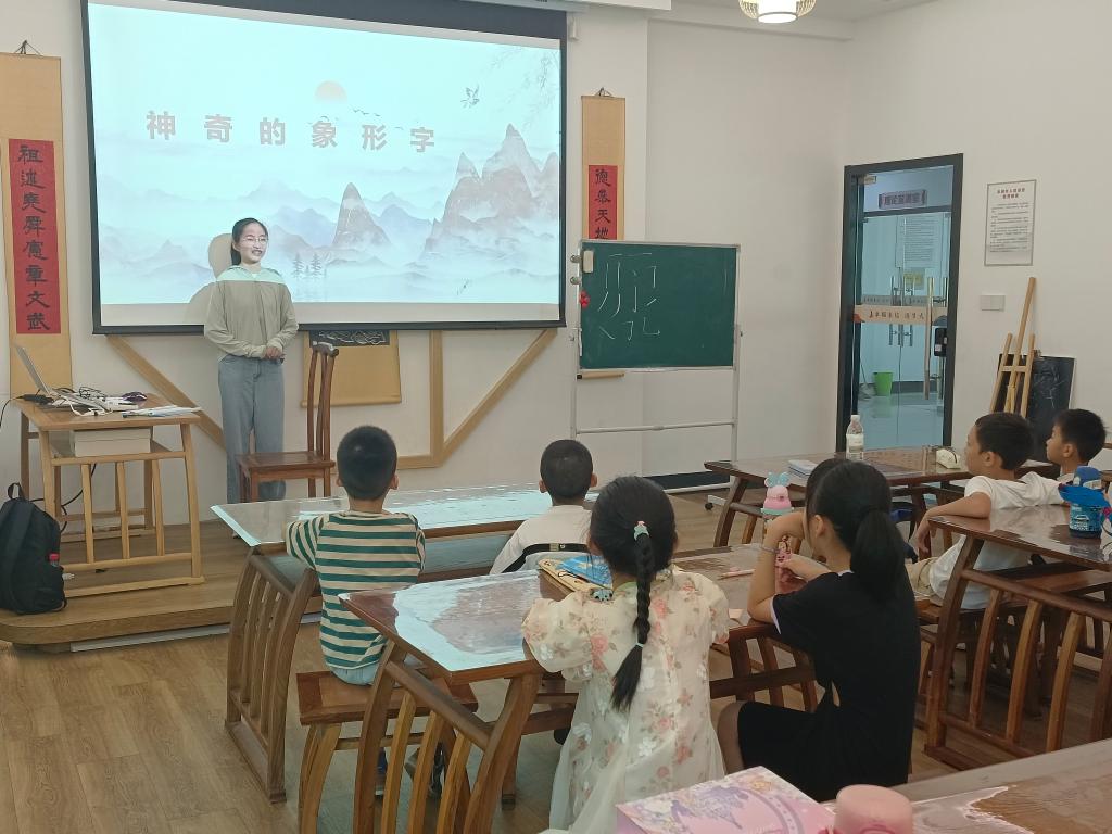 早晨,大洋社区的教室里充溢着孩子们好奇和兴奋的氛围。实践队员首先带领孩子们走进了甲骨文的世界。甲骨文,作为汉字的早期形式,其独特的符号和结构激起了孩子们浓厚的兴趣,实践队员用一个个视频和有趣的讲解,让孩子们在轻松愉快的氛围中了解了甲骨文的起源和演变过程,孩子们纷纷举起小手参与互动。