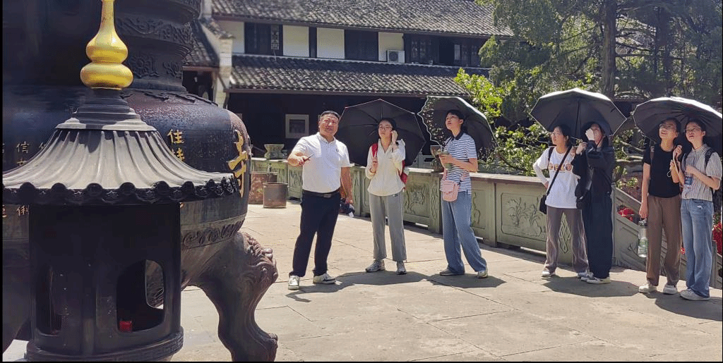 实践队先后行至“东南佛国”天童寺和“晋代古刹”阿育王寺。寺内青石铺就,青松独立,檀香缭绕,可谓“佛界似仙居,偻台出翠微”。天王殿——作为两寺的主殿堂,采用重檐歇山顶结构,筒瓦骑缝,并饰以鸱尾脊兽,展现出典型的中国古代建筑风格。殿内设有佛龛,供奉主要佛像,两侧布有四大天王等护法神像。针对神像姿态的细节,高平老师进行详细解读,寄语学生在研学旅程中务必细致入微,以深化学习。