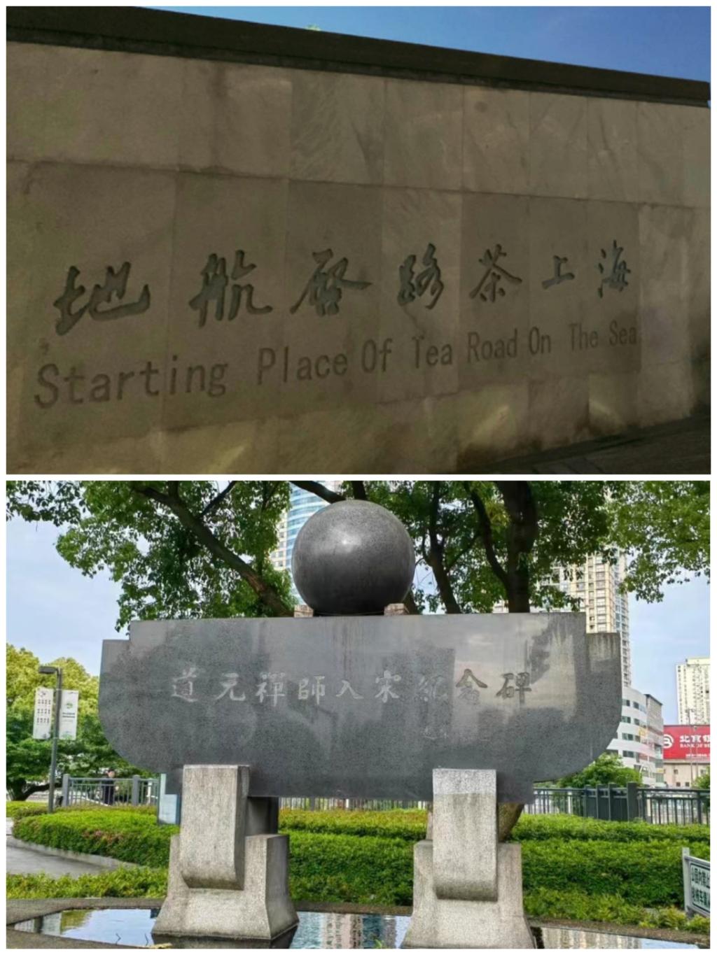距离宁波老外滩展览馆不远处,三江口设有海上茶路启航地纪念碑。该地标设一个主碑、四个副碑、茶叶形船体和船栓群。帆型主碑刻有中英文碑记,前设的船栓群象征古明州樯桅林立、商船云集的繁华景象。最后,考察队来到道元禅师入宋纪念碑处。纪念碑是为纪念南宋日本僧人道元禅师在宁波的求法经历及其对中日文化交流的贡献。其外形独特,似一船行于海上,碑文如帆。顶上的璀璨明珠象征地球的世界性。