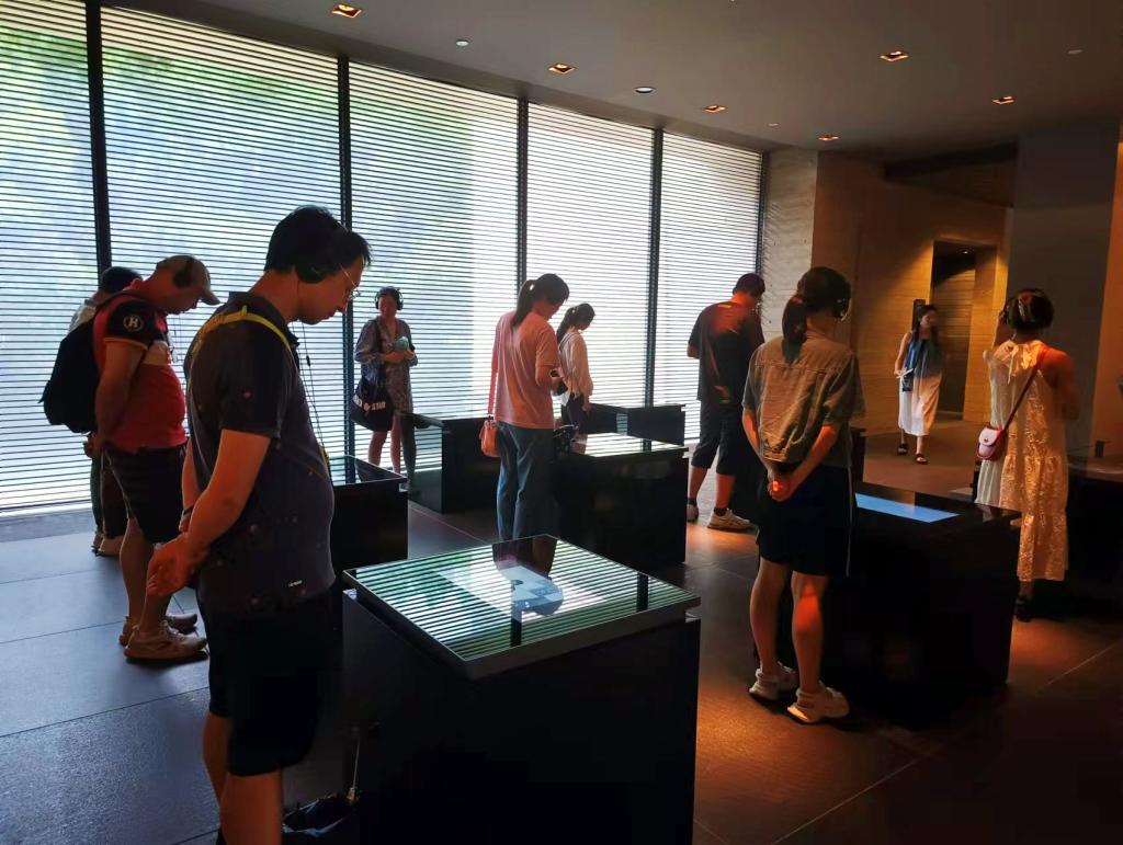 木心美术馆毗邻乌镇大剧院,悬浮于湖面之上。极简的几何外观设计与多变的室内空间构成,使之在一片山林美景中脱颖而出。美术馆由序厅和五个展厅组成,长期展示着木心的各类作品。其中,65万字的狱中手稿无疑成为全厅的核心。密密麻麻的小字被陈列于昏暗压抑的灯光之下,不仅带给游客以视觉上的强烈震撼,更深刻地展现了木心在苦难中的坚韧精神和创作精神。此外,展厅内还设置多个与展品相契合的数字媒介,例如隐蔽于场馆的放映厅,配备有线耳机的电子屏幕等,带给游客沉浸式的阅览体验。