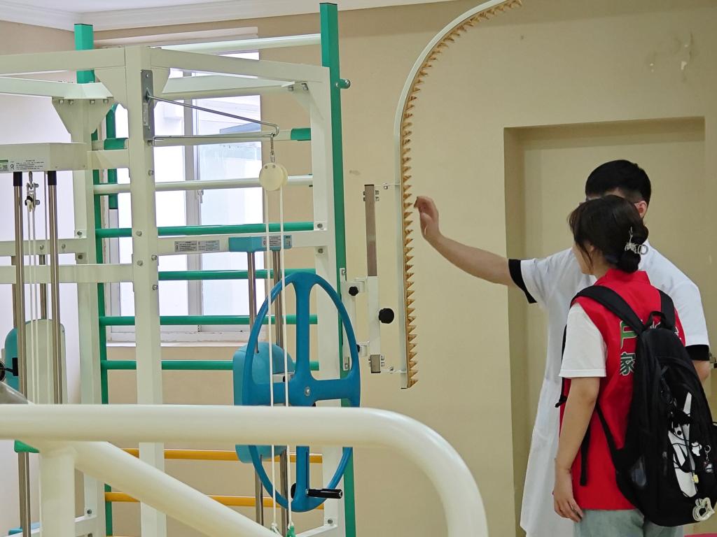 在传统康复技术体验后,实践队成员们跟随着康复医师的脚步来到了康复大厅,参观了现代康复器材。
