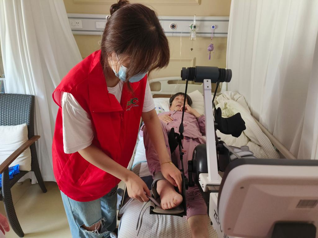 参观完康复器材后,来自康复治疗学的实践队成员在康复医师的带领下进入病房,对病人进行肢体被动运动的康复治疗。被动作业治疗是一种针对运动功能受限或因病痛无法自主进行活动的患者,通过治疗师的辅助或机械装置的帮助,进行肢体被动运动的康复方法。它旨在通过改善关节活动度,促进血液循环,防止肌肉萎缩,提高患者的生活质量。