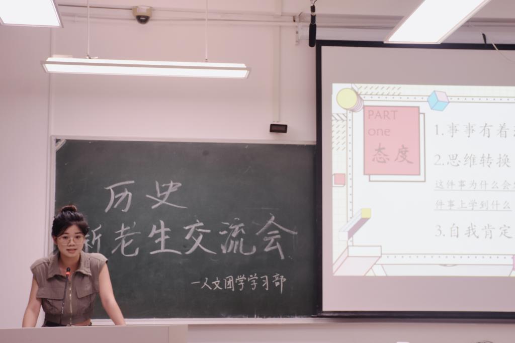 在经验分享环节中,池秀秀鼓励同学们去创造更多的体验。她指出,步入大学篇章,需要同学们不断去摸索学习,勇于追求,敢于试错,并积极培养兴趣特长,参与社团活动,也可以投身志愿活动,积累社会经验。杨子吟重点向大家介绍了有关历史学习的内容,从学业成绩、集中实践环节、评奖评优三个方面向大家阐述了多方面综合发展的重要性,鼓励同学们进行大量历史书籍的阅读,并提高对于体测和奖学金的重视程度。陈星颖则分享了一些学生会工作的心得,以自身经验为例,围绕态度、平衡和收获三个关键词,启示同学们可以平衡工作、学习和生活,学会肯定自我价值,在每一次踏实的工作中收获经验和成就感。