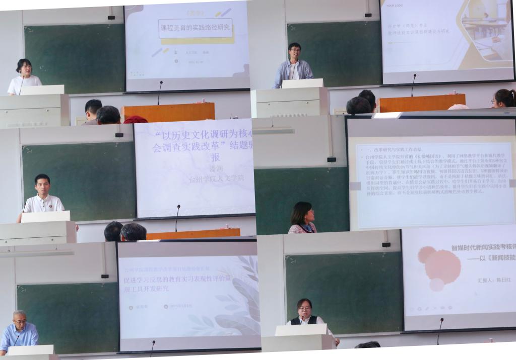 本次验收采用“校外评审+校内汇报”模式。校外专家提前评审项目材料,校内汇报中每位负责人用8分钟结合多元形式展示改革实践。汇报环节亮点频现:陈楠老师团队针对美学课程抽象化的特点,创新“循环课堂+整合式教学”模式,通过线上预习、线下实践讨论的闭环,将理论与生活审美结合,课程入选中国高等教育学会优秀案例,并推动教材编写;康海荣老师主持的“教育实习评价量规工具开发”项目,邀请学生参与设计,开发2.0版工具,聚焦教学技能细分模块,获得评审组“师范教育评价突破”的肯定;还有老师团队深耕乡村振兴调研,打造“调研—竞赛”教学体系,相关项目获浙江省大学生科技作品竞赛银奖等多项荣誉,实践育人成效显著。