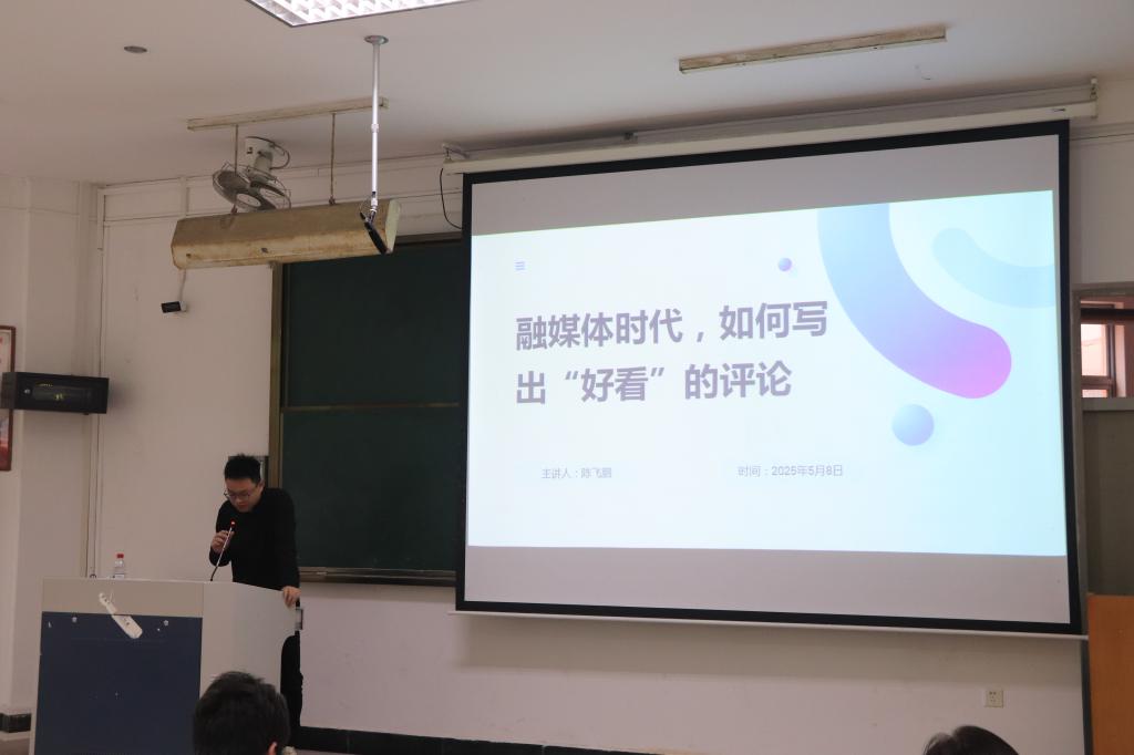 5月8日上午,台州日报资深评论员陈飞鹏受邀为同学们带来《融媒体时代,如何写出“好看”的评论》讲座。他结合亲身工作经历、个人自身发展,抛出多个实际案例生动地给同学们分享多年工作经验与人生感悟。从理论学习到具体实践,从选题到具体撰写,每个细节都有着不同的要求。谈到AI写作时,陈飞鹏认为Deepseek撰写的新闻评论,即便足够高大上、足够生动,但与人类所写的新闻评论来说,依旧“缺乏人性的温度”。此外,陈飞鹏还分享了撰写新闻评论的大量“干货”,如“写评论短句多一些,会比长句更有力量,长短句的结合会让文章更有力”。