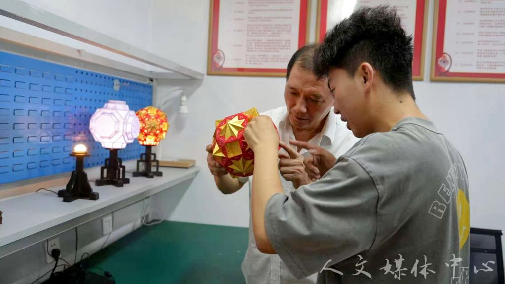 “因为热爱,才肯钻研。这也许就是非遗传承人的‘轴’吧!”抚摸着手中精美的六面宫灯,余月华向实践队员们打开了话匣子。2003年,他在为老师王汝兰抢修电路时,被满屋流光溢彩的花灯深深震撼,从此投身这门古老技艺。起步阶段异常艰辛,“那时候,光学习画图纸就花了一年,反复打磨每一条线的精度。准备比赛时,常常熬到凌晨三四点。”他回忆道。最考验功夫的是针刺环节,“误差必须控制在毫米级,不然灯纸一刺就破。”只见他手中的绣花针在特制灯纸上精准起落,细密的小孔逐渐构成福字与龙凤纹样,光线透出,宛如星辰闪烁。余月华介绍,无骨花灯始于唐代,鼎盛于明清,以纯手工针刺、无骨架粘贴为特色,寓意人丁兴旺,但在近代因战乱与手工业衰落几近失传。“多亏2000年政府开始抢救,2006年列入国家非遗,这门手艺才算真正‘活’了下来。”