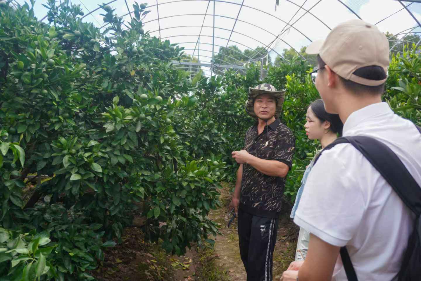 大棚内,鸡蛋大小、青绿饱满的柑橘如小灯笼般挂满枝头,压弯的枝条被细心的果农用绳子轻轻拉着。旁边的水渠与智能滴灌管网静默相连,无声保障着这片甜蜜产业的命脉。实践队成员们穿梭其间,触摸着科技赋予传统农业的温度与力量,观察着生物防虫的巧妙装置,聆听着新农人关于嫁接改良、错峰精销的智慧之谈。