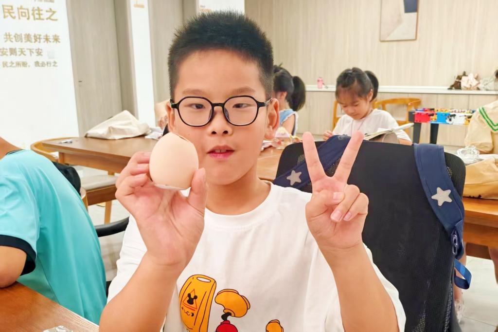 孩子展示制作的萌芽蛋