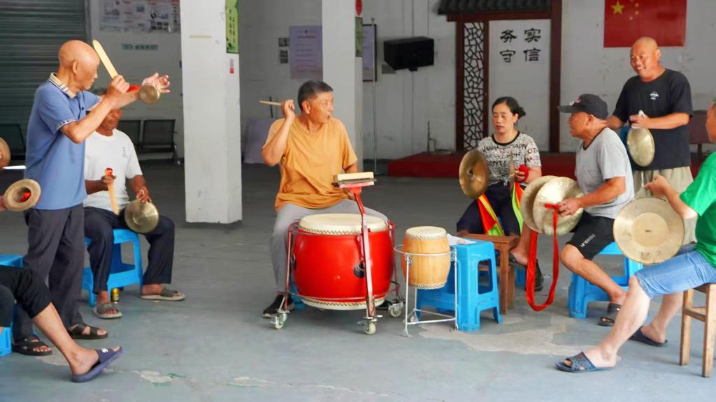 田市镇吴桥下村文化馆负责人李美珍召集村民,为实践队展示了鲤鱼跃龙门的配乐表演。参与演奏的均为年过六旬的长者,他们手持摆鼓、铜锣、钹等民间乐器,围坐成圈,依照一份简单却精准的乐谱进行演奏。乐谱上仅标注了每件乐器的敲击次数和停顿位置,但老人们的表演却展现出惊人的感染力。鼓点铿锵有力,节奏明快响亮,饱满的声浪极具穿透力。更难得的是,他们对节奏的掌控极为精准,齐奏时气势磅礴,休止时干净利落,默契的配合将“鲤鱼跃龙门”的激昂意境展现得淋漓尽致。拍摄过程中,实践队员们采用多机位布设,完整记录了民间艺人的演奏过程。队员们特别注重捕捉老人们手持摆鼓、铜锣、钹等传统乐器演奏时的神态细节及韵律细节,保证记录到位。