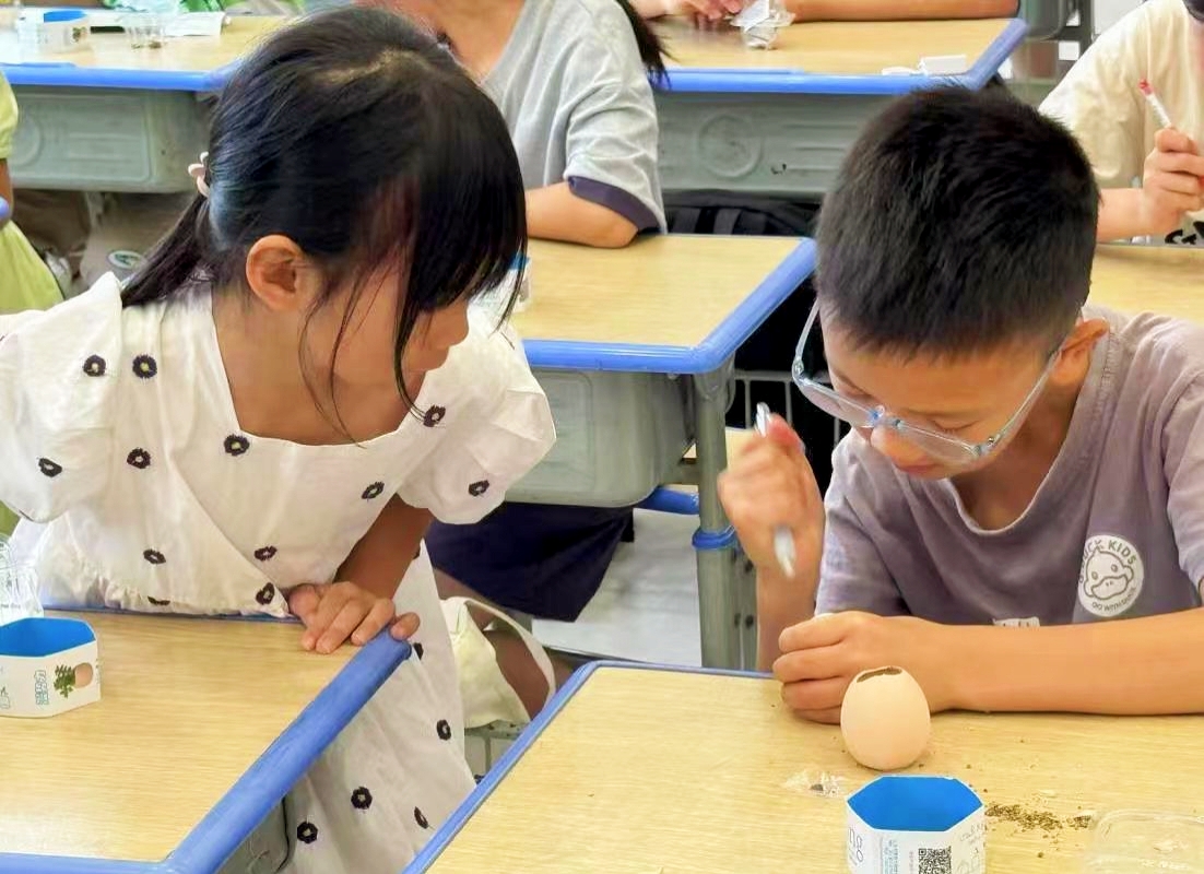 在萌芽盆栽种植环节,孩子们专注地拿起工具,将蛋壳小心地敲开,再轻轻将种子埋进土里,最后缓缓浇上清水。他们盯着蛋壳,眼神里满是对生命萌发的期待,仿佛在与小小的种子许下成长的约定。