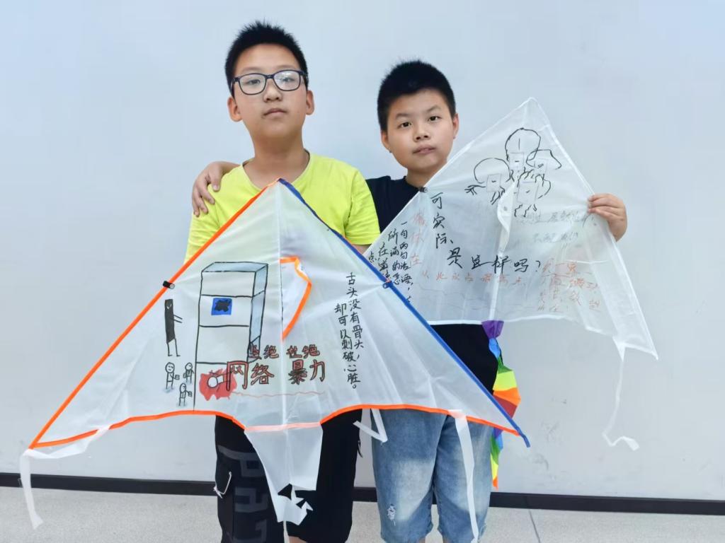 践行文明上网,用规则守护成长。互动环节,一场别开生面的“健康上网风筝绘”活动就此展开。孩子们三人一组围坐在一起,在队员们的引导下,将健康上网的规则融入画笔。当孩子们举起画满规则与期盼的风筝时,活动室里瞬间成了五彩斑斓的“文明天空”。