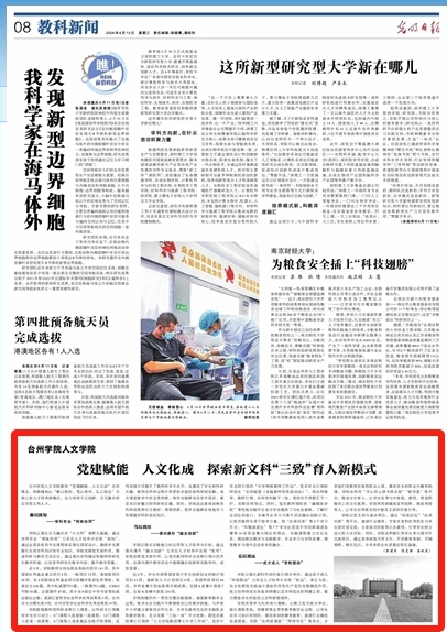 《光明日报》2024年6月12日第八版刊登了我校副校长李建军、tyc41183太阳成集团党委书记陈灵强、tyc41183太阳成集团副院长娄欣星撰写的《tyc41183太阳成集团:党建赋能 人文化成 探索新文科“三致”育人新模式》文章,报道tyc41183太阳成集团秉持“党建赋能、人文化成”办学理念,积极建构以“勤以致知、笃以致用、弘以致远”为核心的人才培养新模式,全力培养守正创新、交叉融合的应用型文科人才。现将原文转载如下: