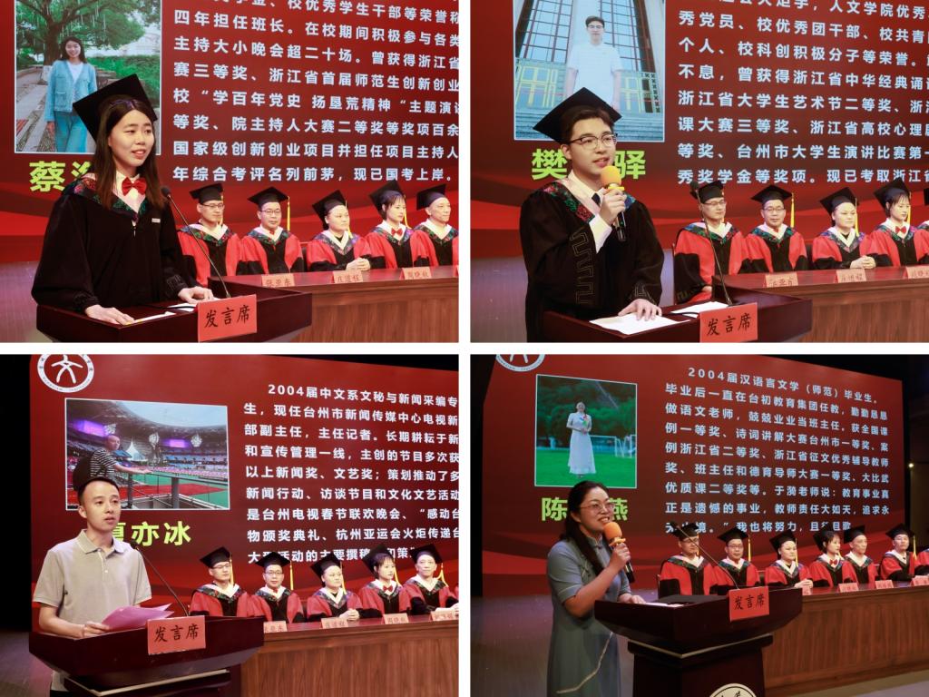 20中教1班蔡海琳和20中文2班樊柯驿代表2024届全体毕业生进行发言。他们回忆了四年里与这座城、与台院、与良师益友温馨快乐的点点滴滴,衷心祝愿母校再展宏图,祝愿每位毕业生前程似锦。毕业二十周年04届优秀校友代表夏亦冰和陈琳燕深情回顾了往昔的大学美好记忆,表达了对母校和老师的衷心感谢,并与毕业生们分享了自己在工作生活中的心得经验,祝愿同学们怀着勤勉与才华奔赴远方。