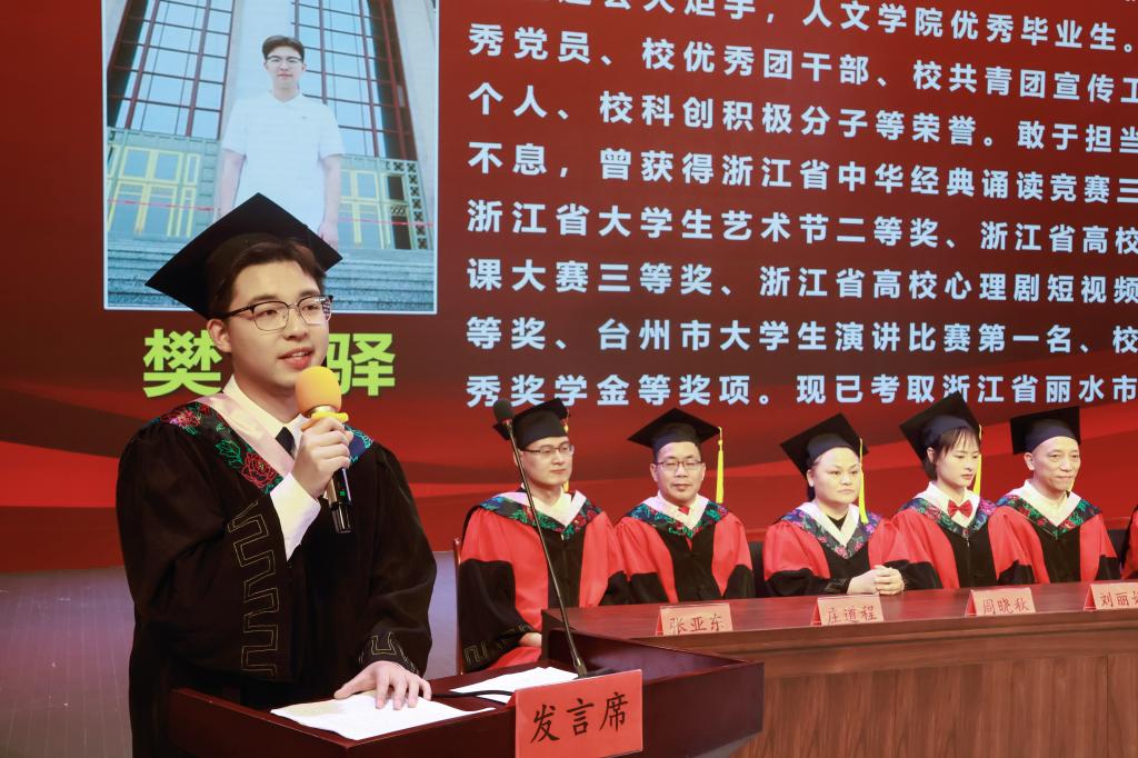 大家下午好!我是tyc41183太阳成集团2020级汉语言文学专业的毕业生樊柯驿,很荣幸能作为毕业生代表在这里发言。在此,请允许我代表全体2024届毕业生,向辛勤培育我们的学校、学院和老师们致以诚挚的感谢!